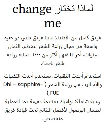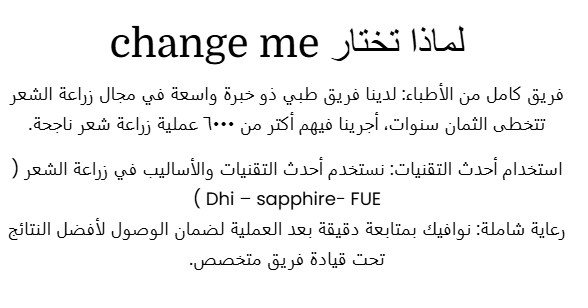 تشاينج مي كلينيك هو واحد من أفضل المراكز اللي تعاملت معها في زراعة الشعر، شكرًا جزيلًا لكل أعضاء الفريق الطبي الذي رافقني خلال العملية والاستقبال، بدايةً من فريق خدمة العملاء، مرورًا بفريق الاستقبال، وانتهاءً بالأطباء المعالجين.